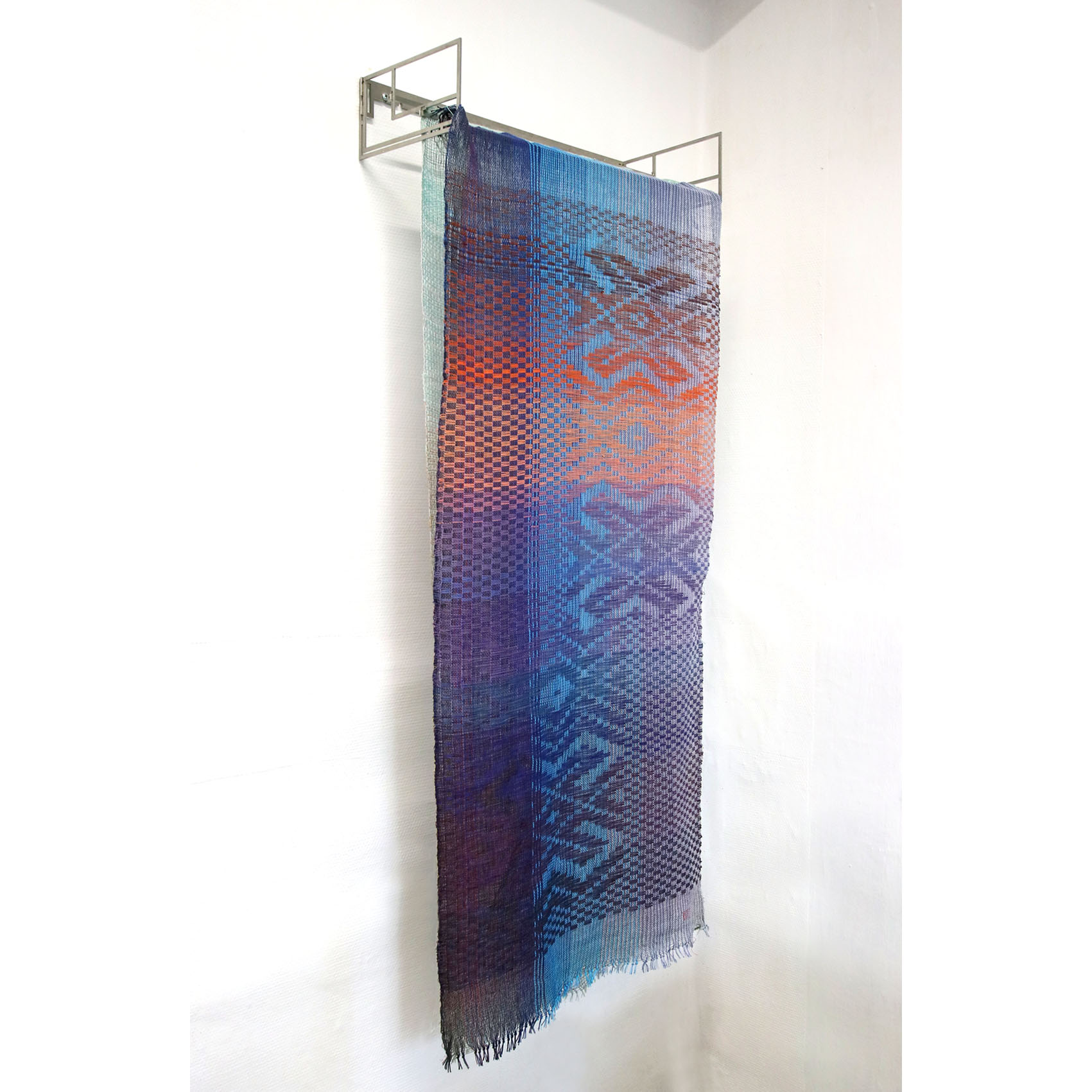 Sejpak after finishing touches. Process of searching the ways of presenting the textile. The piece is woven as a double cloth on a Louet Spring loom with 12 shafts. As a warp I used organic cotton and as a weft - linen. With purpose I have broken the axis of symmetry. The size of the textile is ca. 150 x 64 cm.